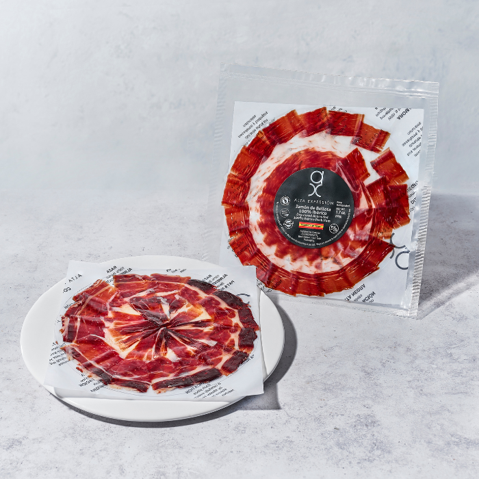 Our innovative round tray format comes pre-sliced and ready to serve, making it effortless to enjoy premium Spanish ham at home. Just remove the protective film, slide off the parchment, and your platter is instantly ready for any occasion.